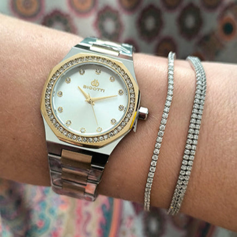 Discover the perfect blend of sophistication and modern elegance with the Bigotti RG and Stainless Steel Men's Watch. Crafted with meticulous attention to detail, this timepiece features a stunning silver dial adorned with sparkling stones, making it a versatile accessory for any occasion. Whether you're dressing up for a formal event or adding a touch of luxury to your everyday look, this watch is designed to elevate your style.